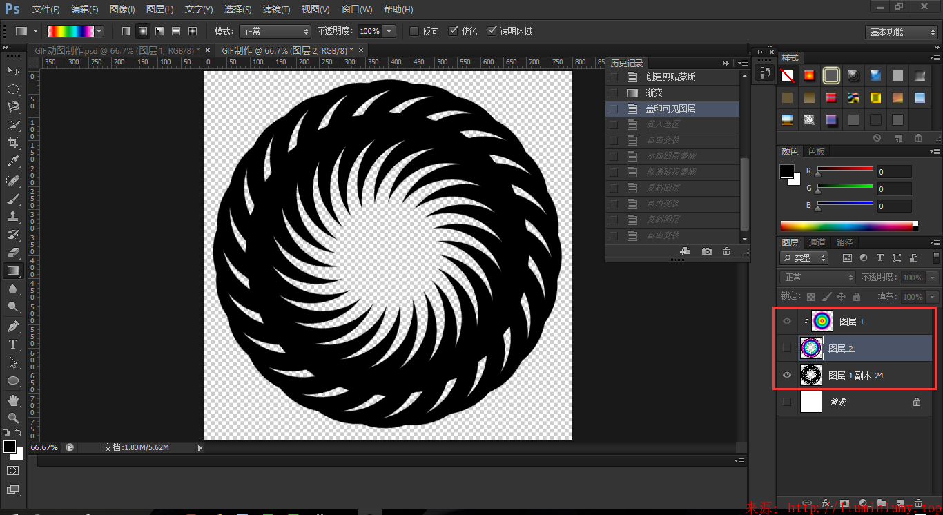 4.ctrl+T自由变换-定圆心-属性栏设置旋转15度-enter键确定-ctrl+shift+alt+T。合并所有图层并调整至画布大小;